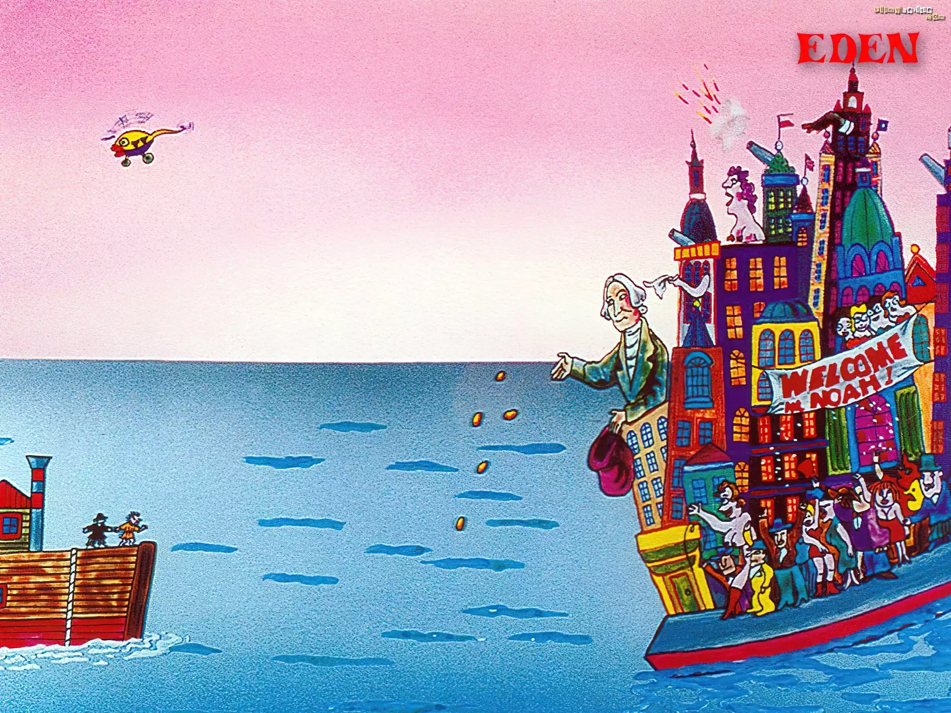 Eden, stworki Film animowany, Eden, Posejdon Eden, dziwne, ptaki, człowiek Eden, bajka święci, Film animowany, Eden Eden, budynki, woda Eden, statek, wieloryb