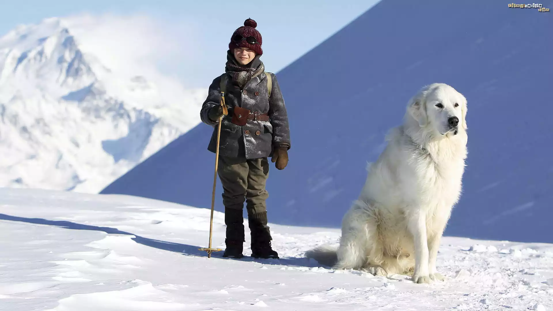 Film, Bella i Sebastian, Dziecko, Félix Bossuet, Pirenejski pies górski, Góry, Alpy, Zima