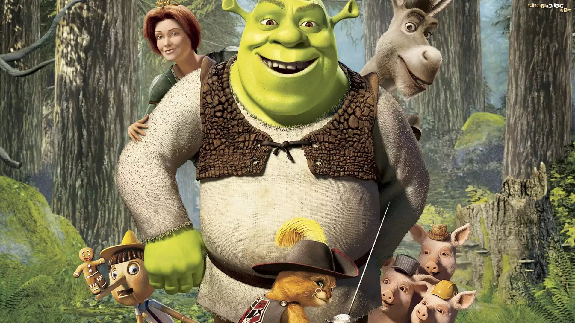 Shrek, Osioł, Fiona, Pinokio, Ciastek, Kot, Świnki, Las