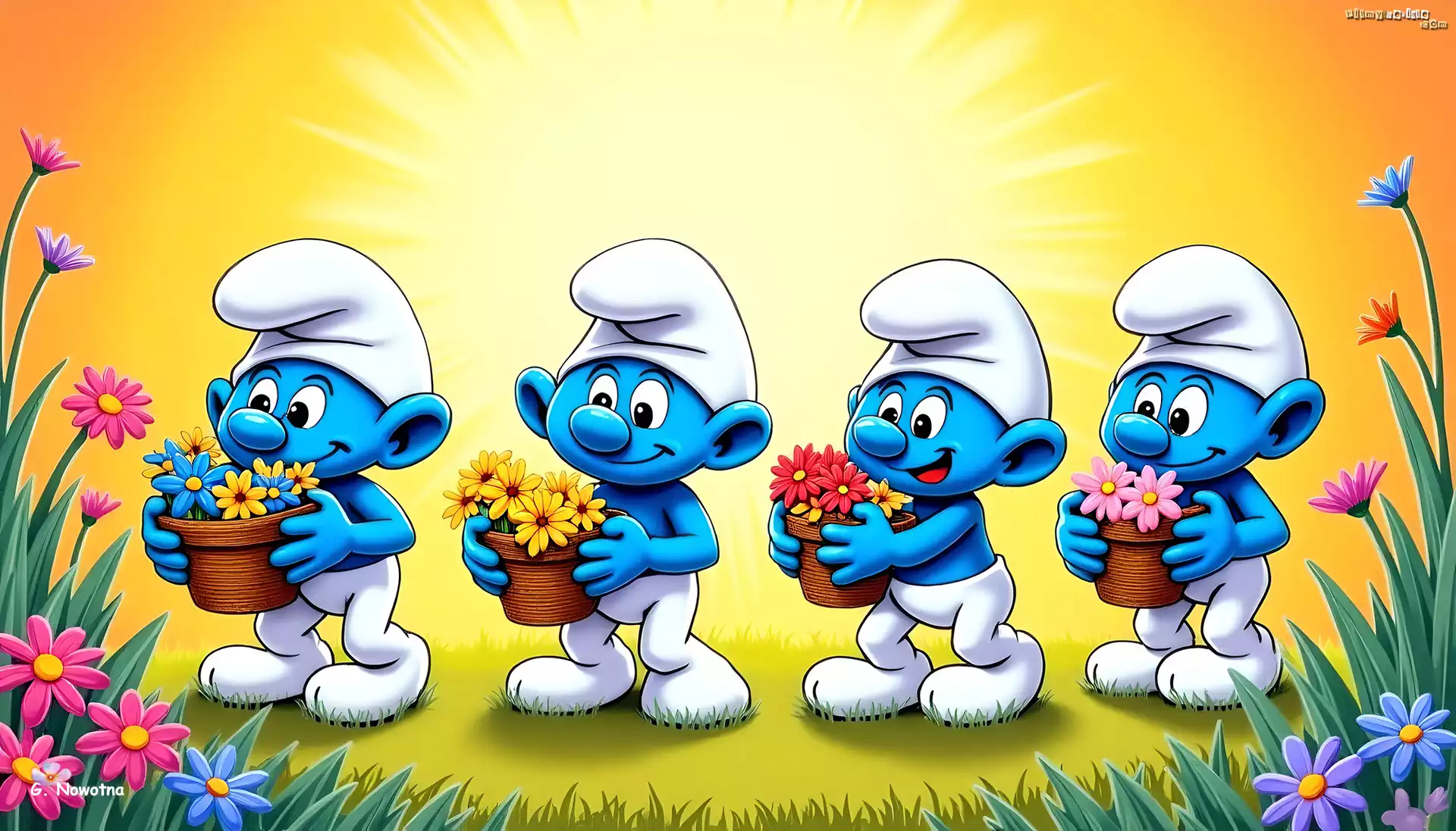 Cztery, Smerfy, Koszyczki, Kwiaty, Grafika