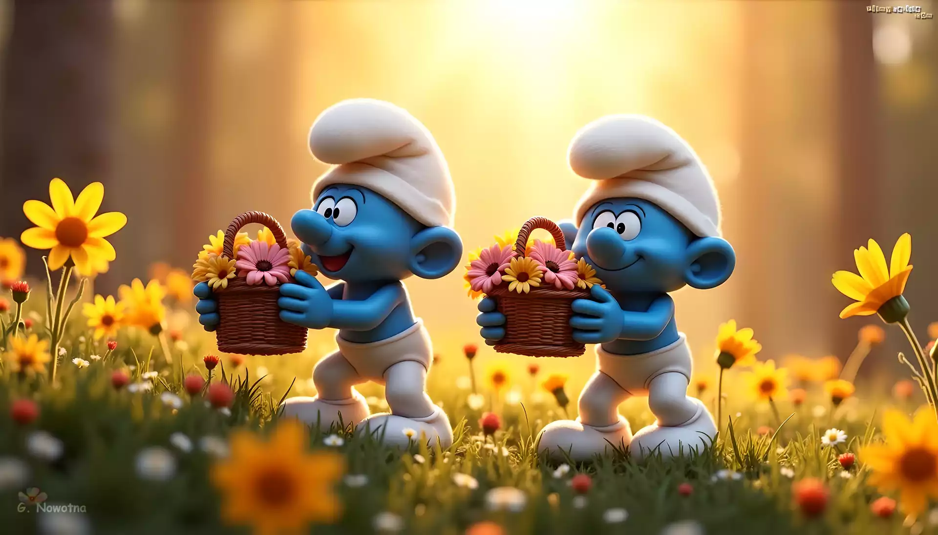 Dwa, Smerfy, Koszyczki, Kwiaty, Grafika