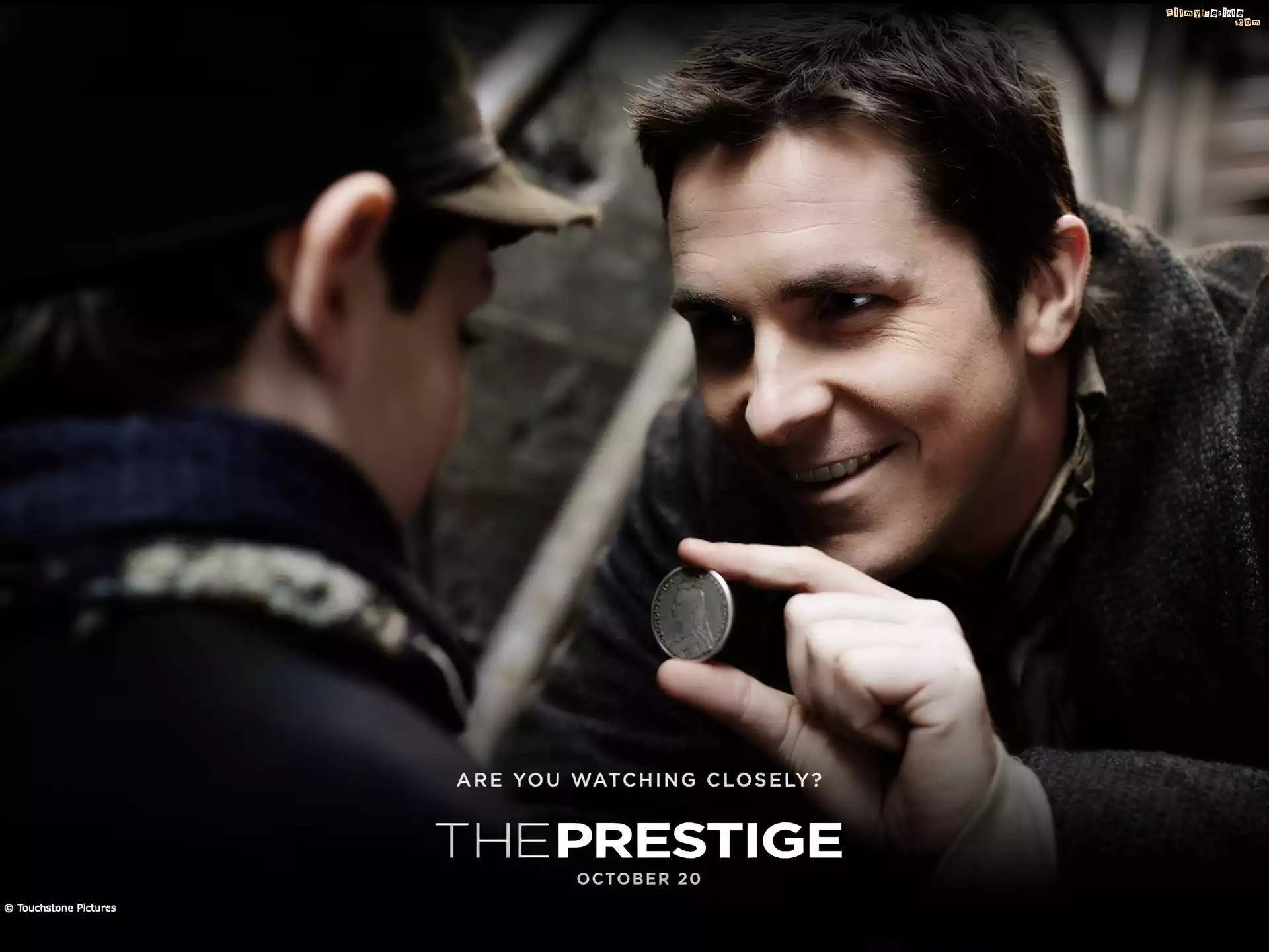 The Prestige, Christian Bale, twarz, aktor The Prestige, Christian Bale, moneta, chłopiec The Prestige, Scarlett Johansson, twarz, loki, napis The Prestige, Christian Bale, aktor, płaszcz