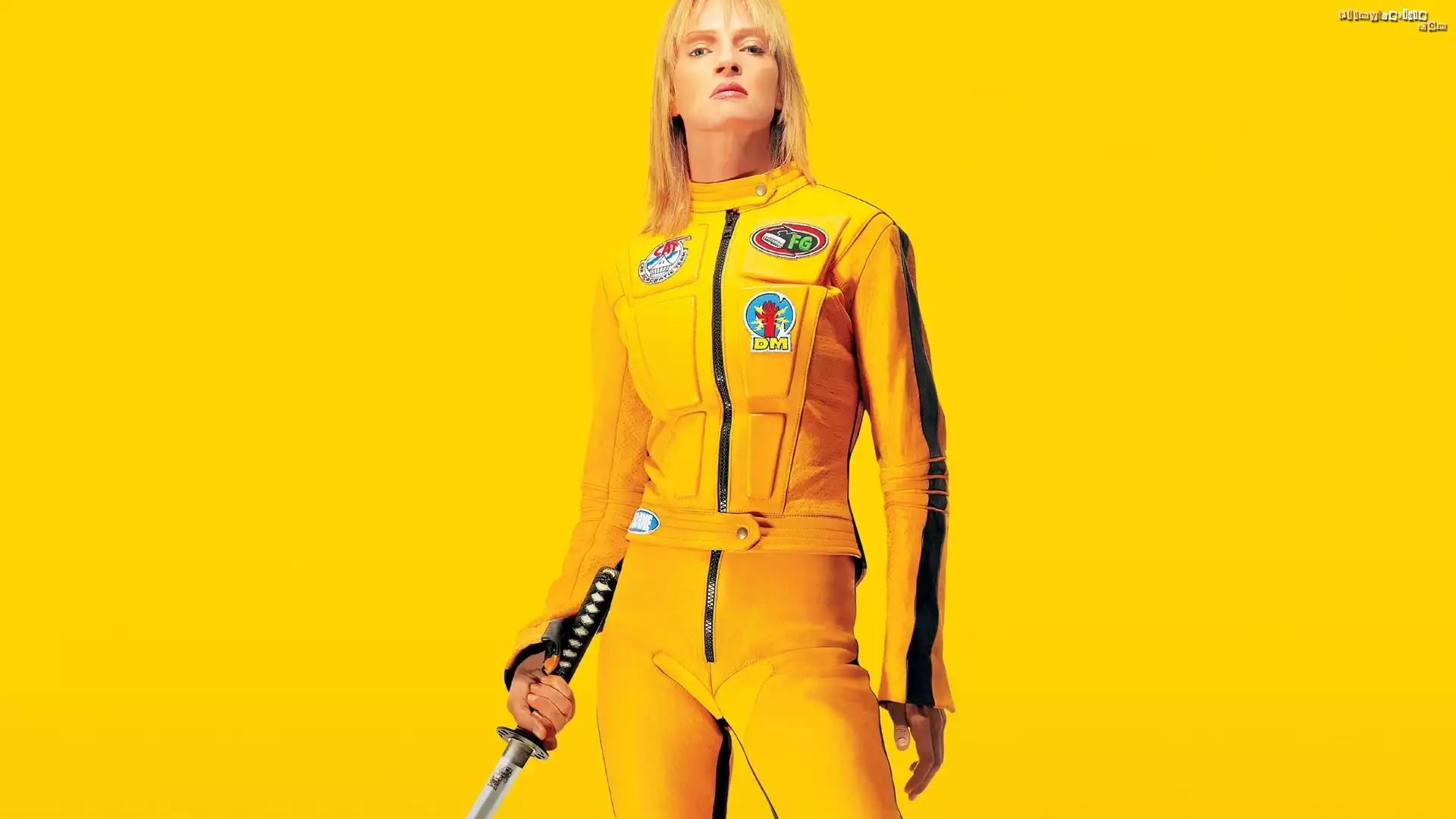 Uma Thurman, Miecz Kill Bill, Vernita Green Pussy Wagon Katana Elle Driver chusta, miecz żółty, kombinezon, Uma Thurman Trzy, Pingwiny Kill Bill, O-Ren Ishii Uma Thurman, Miecz, Kill Bill 1 kimono, Miecze walka, trup, Uma Thurman Kill Bill, żółty, czarny Kill Bill, pojedynek